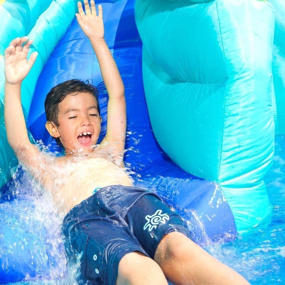 Inflatable Water Slide - Huge Kids Pool (14 Feet Long by 8 Feet High) with Built in Sprinkler Wave and Basketball Hoop - Heavy Duty Outdoor Aqua Blast Lagoon - Blower Included Are you ready for a waterpark in your own backyard! Banzai's New Aqua Blast Lagoon Water Park is an 8 foot high water slide pool adventure all in one. Super easy to set up, takes less than 2 minutes. This amazing water park includes a super fun wall to climb, slide to come racing down along with water spraying wave and overhead sprinkler to keep you refreshed. There is also a built in basketball hoop for bonus play. Kids will have endless fun all summer long while staying cool in the sun.