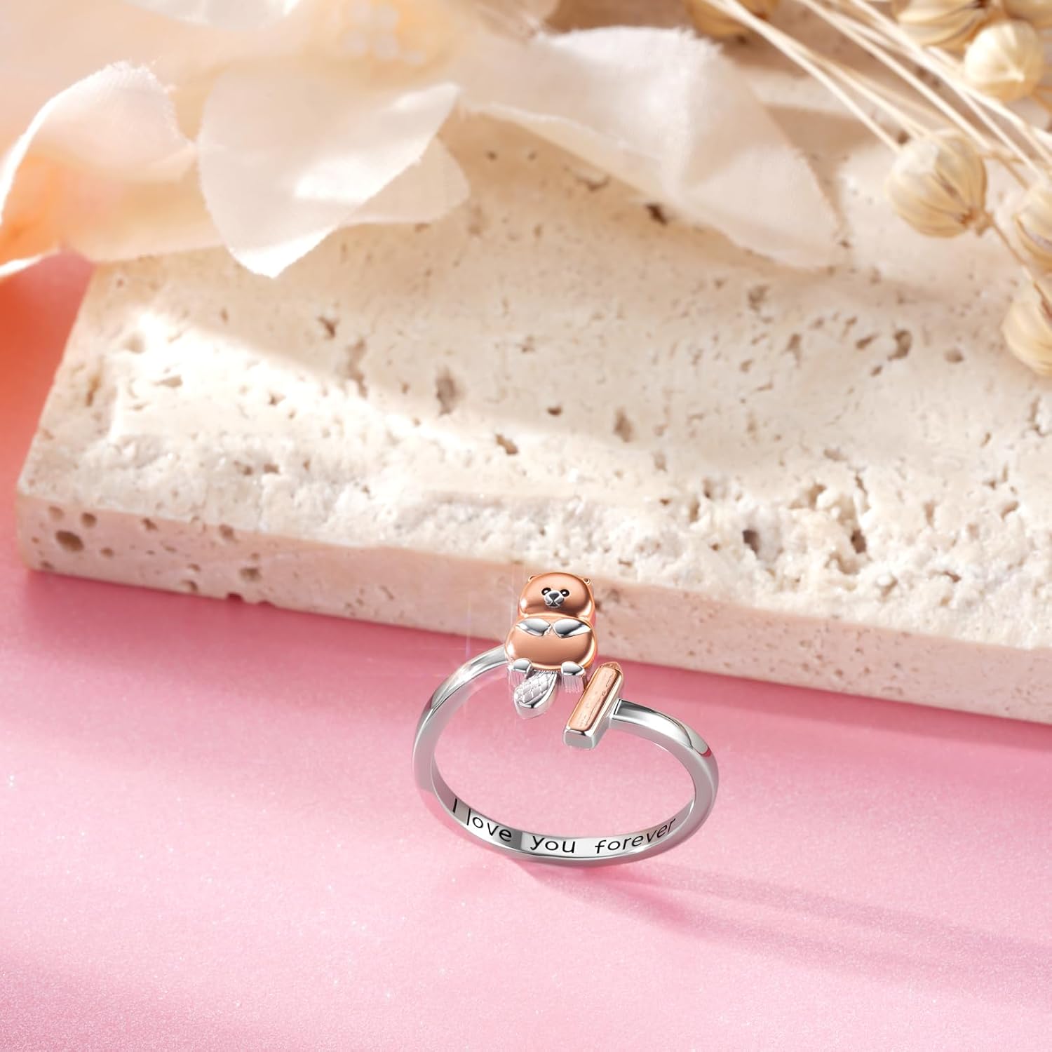 Beavers Ring for Women 925 Sterling Silver Cute Animal Adjustable Ring Animal Jewelry Beaver Gifts for Women On Mother's Day Thanksgiving Day Christmas Halloween Valentine's Day