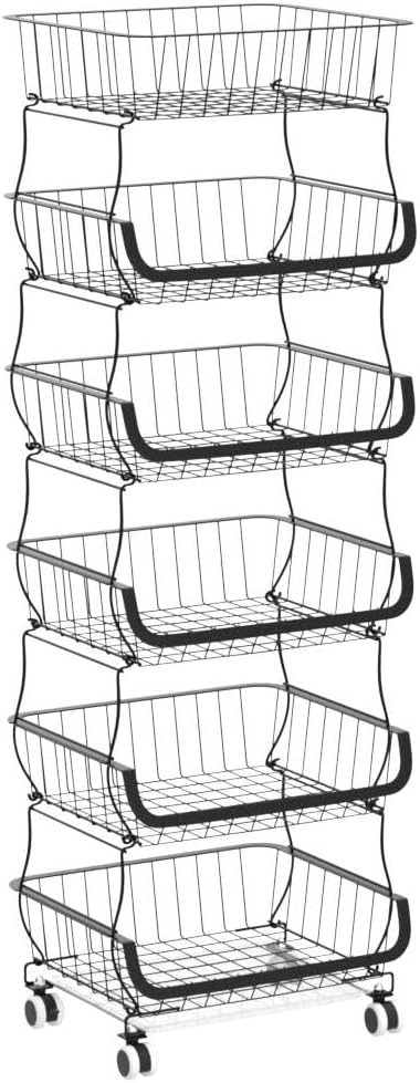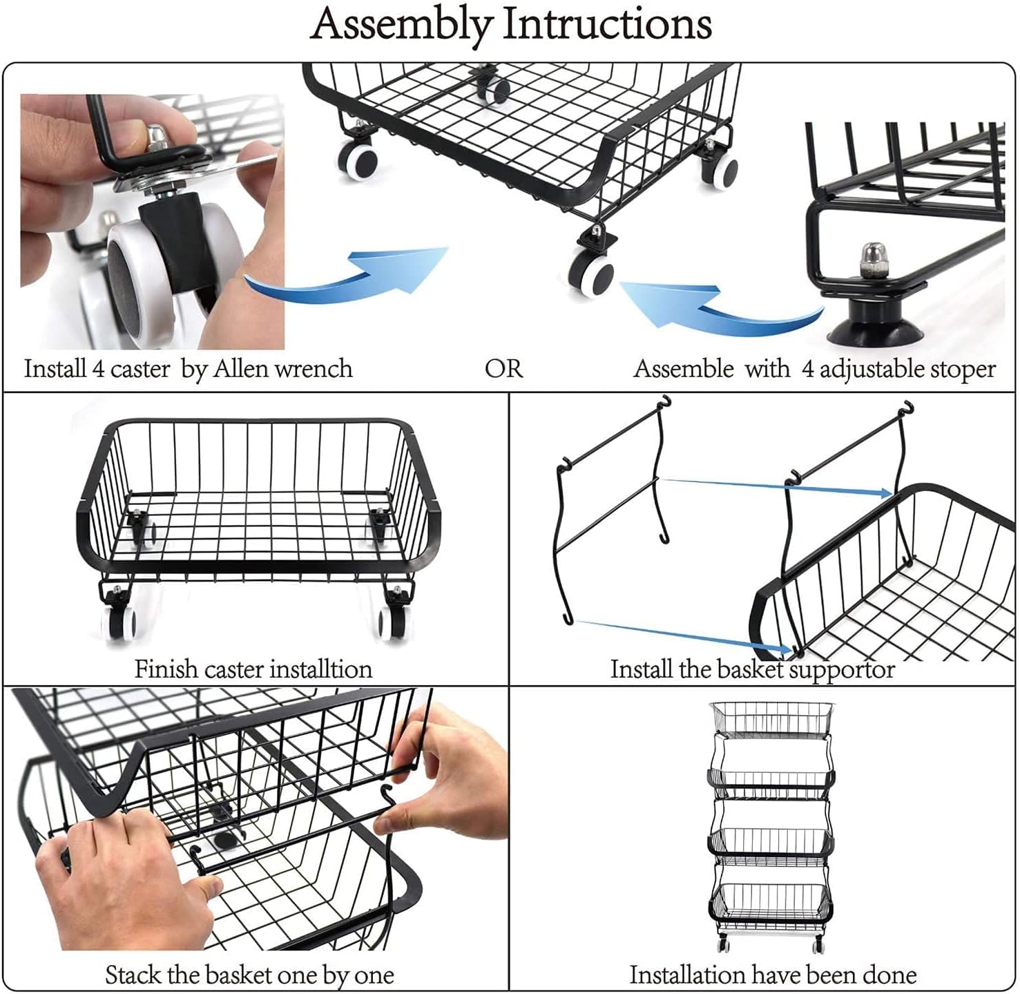 Color: BlackMaterial: MetalLoad Capacity:120lbsLoad Capacity of Each Shelf:30 lbsGW.: 9 lbs / 4.1 kgNW.: 7.9lbs/3.6kgEasy Care: wipe clean with damp clothPackage ListBaskets x 4; Basket Supporter x 6Rolling Wheels x 4 ( 2pcs With Brake)Adjustable Anti-Skid Feet x 4Plastic Tray x 1; Allen Wrench x 1; Nut & Washer x 4