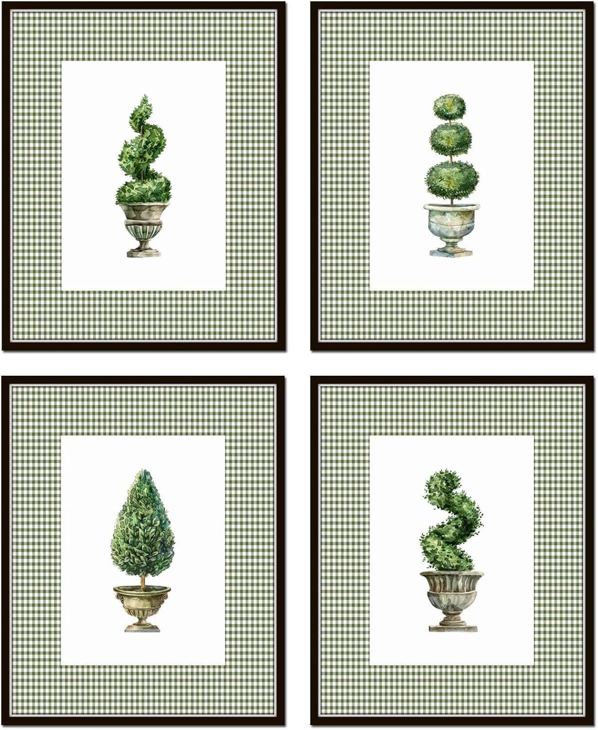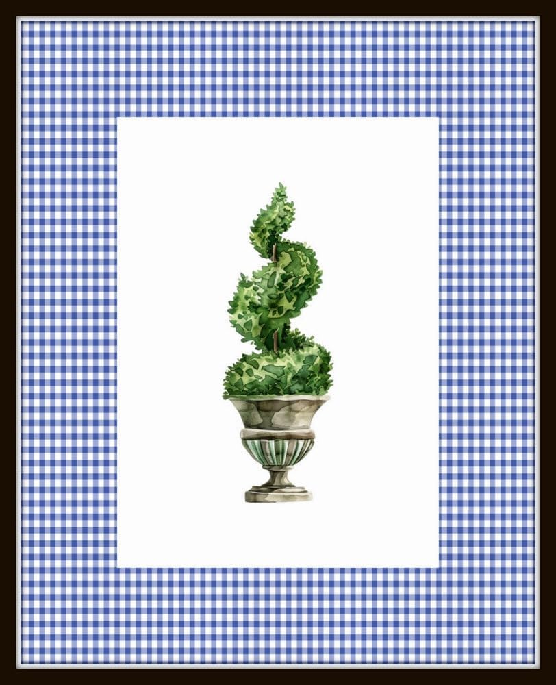 This set features four watercolor topiaries with displayed on a classic royal blue gingham border. This set is also available on a soft light blue gingham border. VINTAGE BOTANICAL PRINTS - Each image has been carefully restored, enhanced and styled to create a unique set of prints. BEDROOM DECOR, LIVING ROOM DECOR, KITCHEN DECOR or OFFICE DECOR - Transform your bedroom into a tranquil retreat with our botanical prints. Create a boho aesthetic or add a touch of farmhouse charm to your kitchen with our prints. These botanical prints make the perfect complement to any boho or farmhouse wall decor. RANGE OF SIZES AVAILABLE - Choose from 5X7, 8X10, 11X14 or 16X20 to add a touch of vintage elegance to your home decor. Our prints are trimmed to fit into standard frames and mats, making it easy to create a stunning display on your wall.MUSEUM QUALITY GICLEE PRINTS - We use high resolution, fine art giclee printers to guarantee that your images are of the highest quality. Our prints are printed on Lightly Textured, Archival, Acid-Free Premium Cotton Paper using fade-resistant pigment-based inks. The result is a beautiful and vibrant image that accurately reflects the original botanical illustrations and will last for years to come. Each print is created and printed by us in our Madison, AL studio, so you can be assured of the highest quality and attention to detail.UNFRAMED PRINTS - The frames shown in our product images are for display purposes only and are intended to serve as inspiration for how you can style and showcase your prints.COLOR VARIATIONS - Due to the differences in monitor and phone screen settings, the color on the prints may vary slightly from your screen.