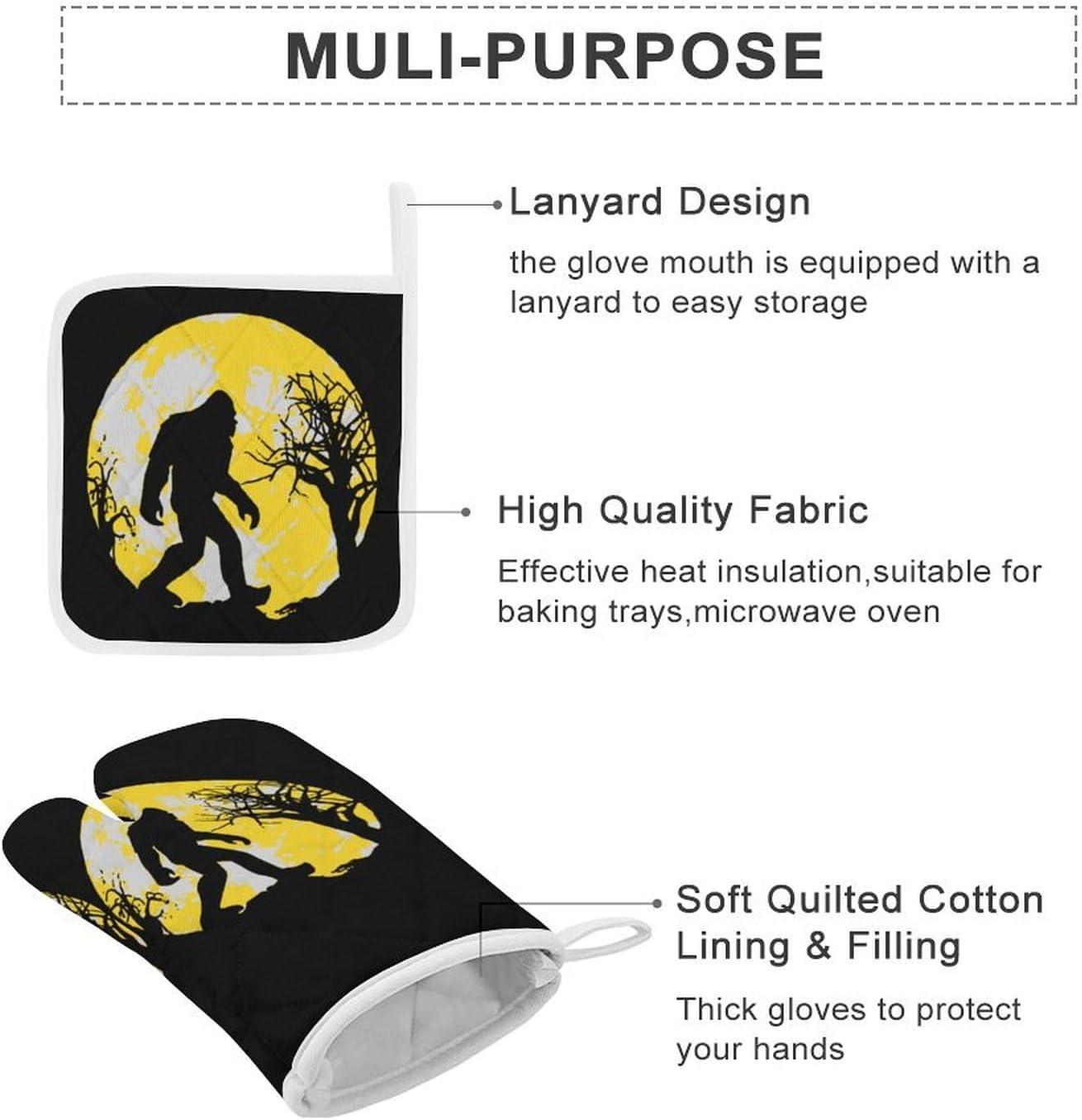 This 3-piece oven mitt and pot holder set is made of washable and reusable fabrics and is suitable for use when cooking and baking in the kitchen such as hot pots, barbecues, and microwave ovens.