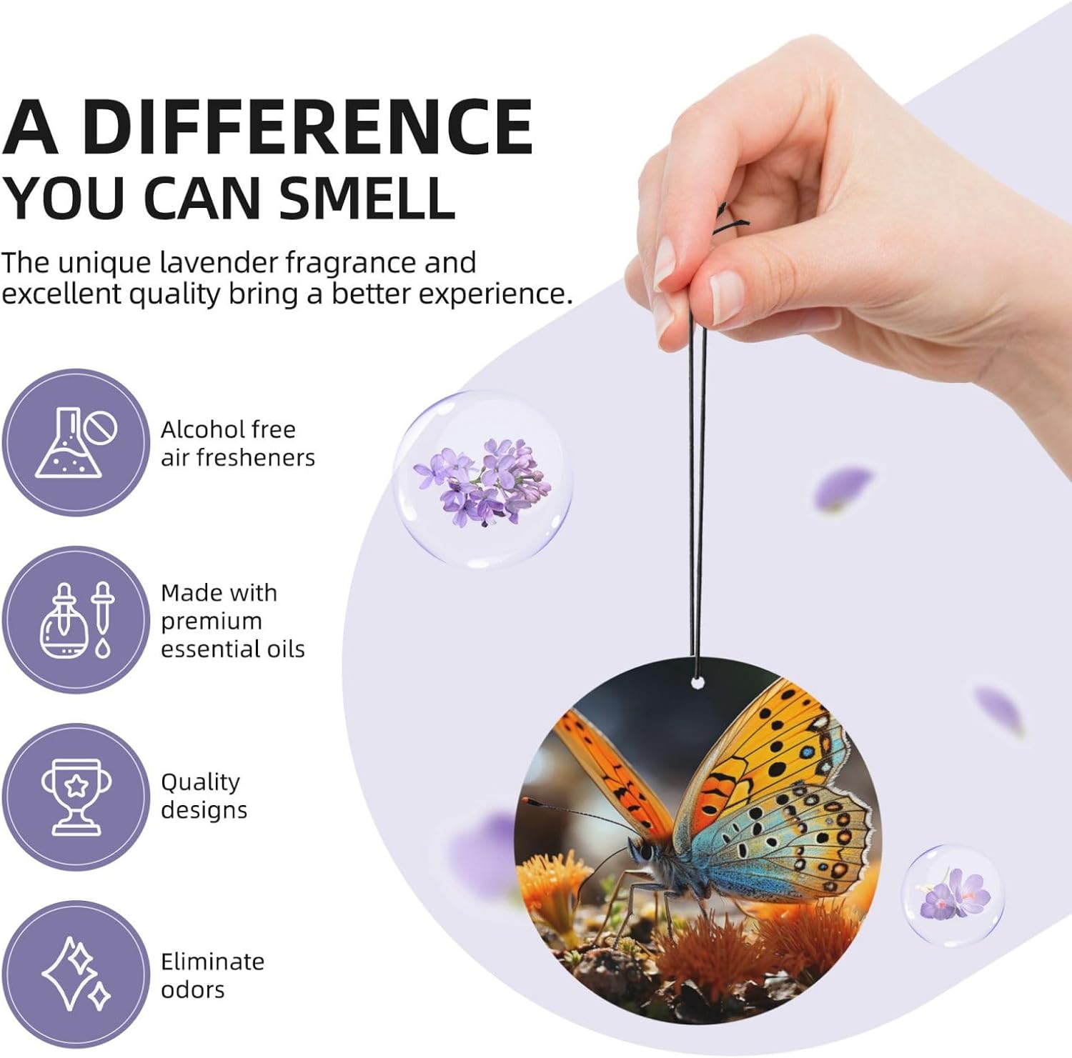 unobstructed vision: this Orange Butterfly rearview mirror scented fresheners doesn't obstruct your vision while driving, ensuring a safe and comfortable journey every time.easy hang: we've included a convenient rope for hanging, making it super easy to attach this christmas air freshener wherever you prefer. No fuss, no mess - just hang and enjoy the fragrance.incredible package deal: this rearview mirror pendant aromatherapy tablets package includes 6 pieces in 6 captivating designs and 1 refreshing scents (lavender). Experience a variety of delightful fragrances that will keep your surroundings smelling wonderful throughout the day.environmental protection: the car air fresheners for women smell can last for about 1-2 weeks. When the smell fades, you can add your favorite perfume. Continue to use, reusable6 pcs included: you will receive 5 individual shoe cabinet fresheners, each in its own package; enjoy consistent scents for nearly a year, or share them with your friends or families