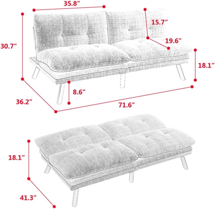 The size of this sofa bed is suitable for small Spaces, and the gives a relaxed and sophisticated look.Three adjustable positions, back: ultimate comfort and comfort for you and your guests. (3 angles available)Comfortable and , with Chenille fabric and 6 metallic black legs, this sofa bed combines comfort and to last in your living space for years to come.Strong wooden frame structure, stable and , comfortable polyester and foam filling.Easy to assemble, you only need to install the sofa feet and connect buttons for the backrestMaterial: Chenille fabric ,Metal legs, wooden frameWeight (lbs.):80.52Size: as shownSet Includes1*sofa(no other presentation items included).Notice:1. Due to manual measurement, please allow 2-3% error, before you bid, please make sure you don't mind.2. The color may vary due to different displays, please refer to the actual product.