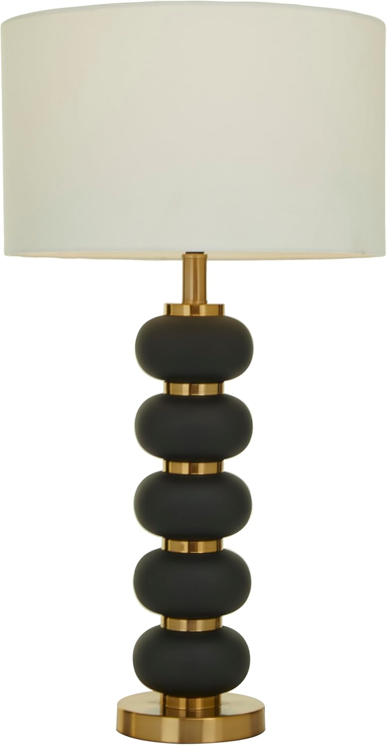 The contemporary living room table lamp is meticulously crafted with welded metal formed into an oblong structure attached to a stretched linen shade. The matte white accent lamp for tables presents drum-shaped shade perched atop a cylindrical post accented by oblong orbs on a round base. Wipe clean with a dry cloth. This white accent lamp is ideal for adding a charming touch to tables and hallways, bathing any room in warm, radiant glow. Designed with felt or rubber stoppers at the base that prevent scratching furniture and table tops, as well as sliding around. Requires 1 60W Type A E26/Medium (Standard) bulb. This item ships in 1 carton. Comes with a 52" cord length. Suitable for indoor use only. This item ships fully assembled in one piece. Table lamp comes with a cream drum shaped shade that measures 15 x 15 x 9 inches. Includes a rotary switch. This is a single white colored accent lamp. Contemporary style.