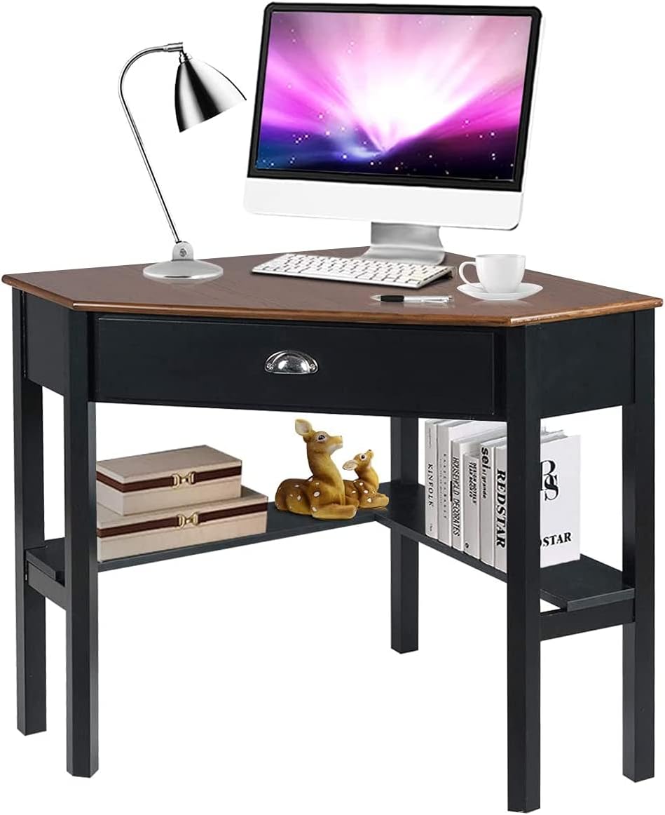 Are you still bothered by the fact that the workstation takes up too much space? Come and try this corner desk. This triangular corner desk can be perfectly placed in the corner of different rooms, which significantly saves you a lot of space and is suitable for small rooms. Meanwhile, the corner desk also offers you adequate space for comfortable working. You can place your office items freely on the desktop and basically will not be limited by the space. You can also take advantage of the drawer and shelf below to store your frequently used documents making your work more efficient. Plus, the corner desk serves as an accent to your room. If you want the corner desk, please come and buy it.