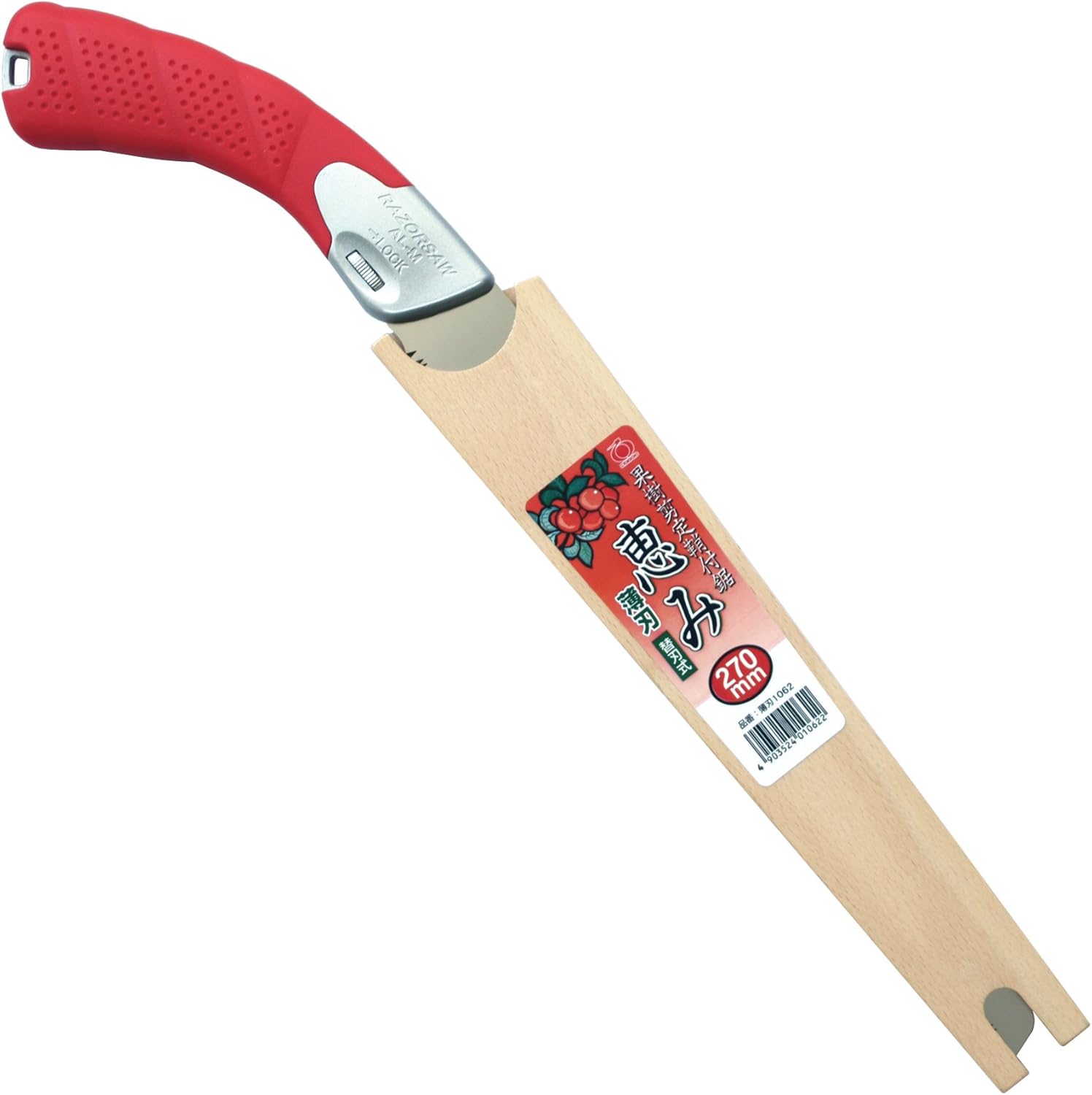 A saw for fruit trees that can cut off thin long branches without shaking and can handle hard branches that freeze in winter. Blade length: 270 mm (thin blade with sheath). Pitch: 2.5mm. Plate thickness: 0.6 mm. Specifications: Impact quenching, rust resistant special surface treatment, laser marking. Gyokucho is the premier Japanese manufacturer of high quality saws with a reputation for reliability and good performance at a modest price. We use a method called impulse hardening to increase the durability of the tooth tips. The cutting edge is heated for 0.003 to 0.005 seconds by applying an electrical current at super high-frequency of 27.12Mhz, instantly hardening the surface of the steel while maintaining the flexibility inside. As a result, the saw’s wear resistance increases. The surface hardness of the blade is approximately from Hv 900 to 1226. The hardened saw tooth is much harder than sharpening files so the blade cannot be sharpened and needs to be replaced once it is dull. All products have a name, blade thickness, the blade length, and even the extra blade part number marked on themselves. The marking is done by a laser irradiation method and won't wear off. So even when you lose the package, you can easily identify the products by checking its laser marking. Electro less nickel plating prevents the blade from rusting, and there is no need to worry cutting materials getting dirty with the rust. Also tree tar is hard to stick to the blade, and even if it does, you can wash it off with water. Suitable for use in coastal areas and even for store exhibition because of its rust-free features.