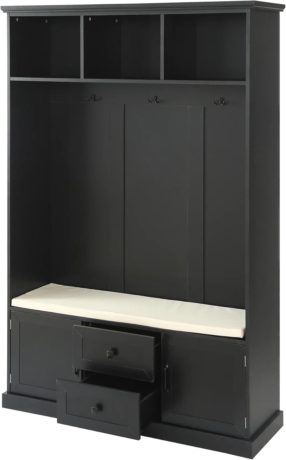 Classic details give our Storage Locker a traditional look, but clean lines and a modern finish bring this hall tree into the now. Generous, sweeping crown molding accents the top of the case; 3-open cubbies lie below it, awaiting your display items, books, accessories and more. The open area beneath the cubbies features elegant beaded-board paneling, 3-double hooks Compatible with coats and bags, and a comfortable seat with cushion. The grand finale of this mudroom storage piece, 2-drawers and 2-doors that allow you to store away even more necessitie.