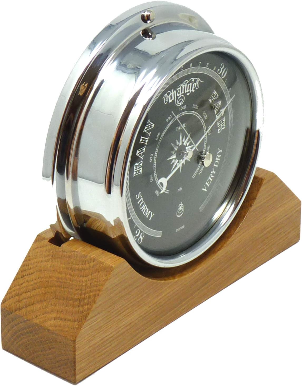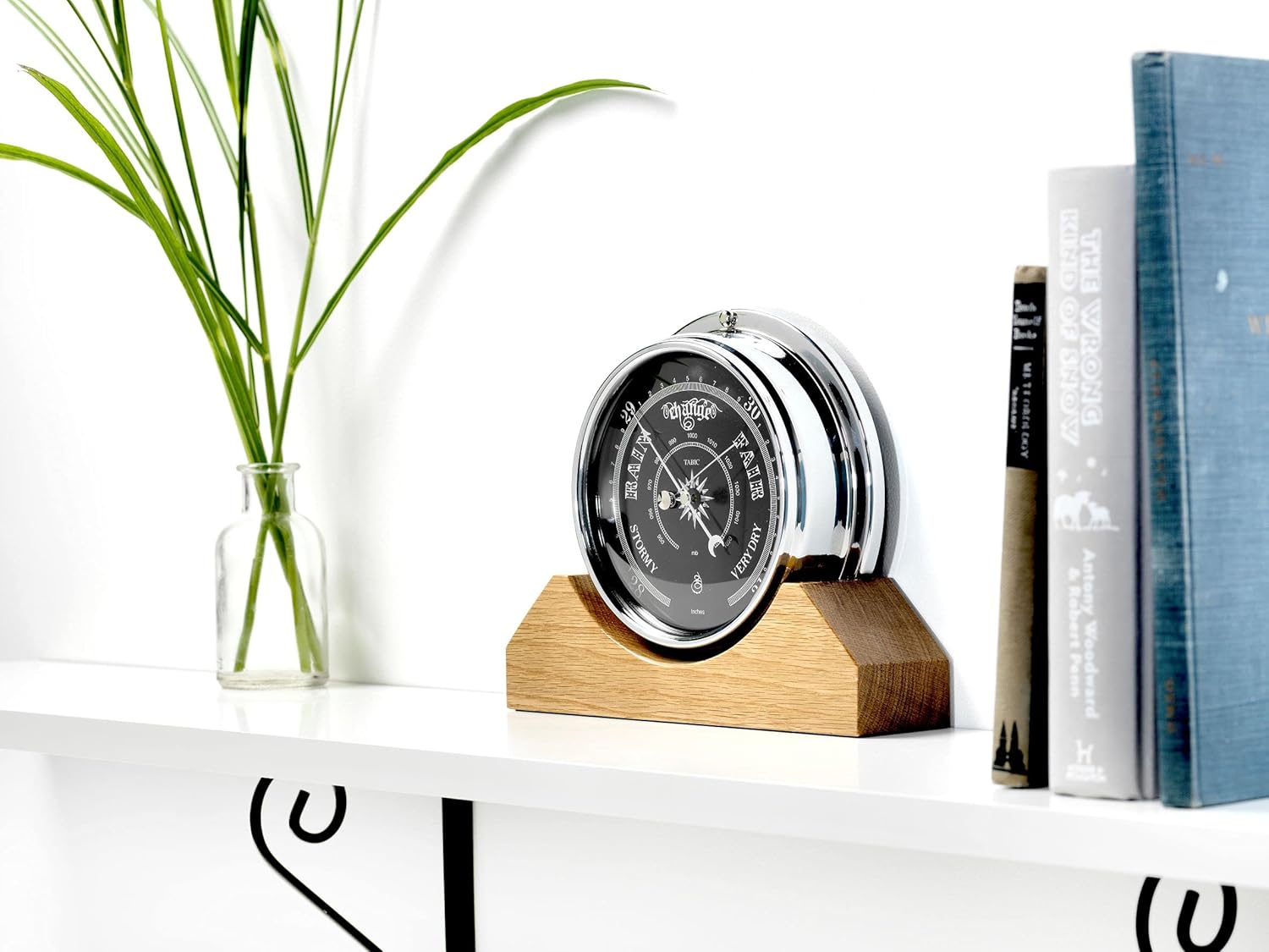 Introducing the Tabic Handmade Prestige Barometer in Chrome, an extraordinary fusion of timeless design and modern precision. This exquisite piece serves as a classic weather predictor and an elegant decor element, seamlessly blending form and function to enhance your home or office. Crafted with meticulous attention to detail, the barometer features a stunning chrome finish that adds a touch of sophistication to your decor. When mounted on the included English Oak Mantel/Display Mount, it becomes a captivating centerpiece, enhancing the ambiance of any room with its timeless allure. Beyond its visual appeal, the Tabic Handmade Prestige Barometer is a reliable and accurate weather forecasting tool. It continuously monitors atmospheric changes, providing you with precise readings to stay well-prepared for shifts in weather conditions. Its classic design seamlessly integrates with modern precision, making it both a functional instrument and a decor statement. Handcrafted with precision, each Tabic Prestige Barometer is a unique work of art, reflecting the legacy of skilled artisans who have mastered the art of creating exceptional instruments. It stands as a testament to the artistry and dedication of British craftsmanship. Elevate your living or working space with the Tabic Handmade Prestige Barometer in Chrome. Whether you're a weather enthusiast or simply appreciate fine decor, this piece offers both timeless elegance and modern accuracy. It's a conversation starter and a functional addition that complements various decor styles. Make a statement with this elegant decor piece and experience the beauty of classic design and the reliability of modern precision in one remarkable instrument. Add a touch of sophistication to your surroundings and ensure you're always one step ahead of the weather with the Tabic Handmade Prestige Barometer.