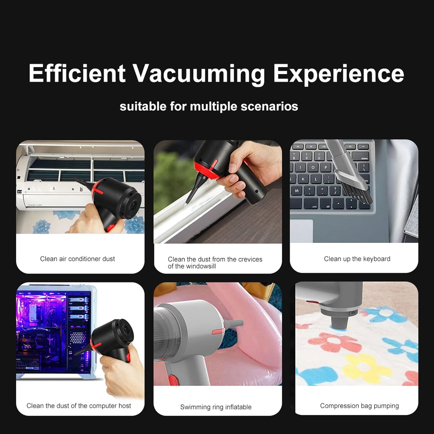 Comfortable cleaning in all areas - floors, furniture and hard to reach spotsPackage Included:1 x Cordless Vacuum & Blow Cleaner1 x Long Flat Nozzle1 x Brush Nozzle1 x Blow Nozzle1 x Suction Nozzle1 x USB CableSpecifications:Material: ABSCharging Time: About 3HoursWorking Time: About 40minSize: About 165x140mm / 6.5x5.5inch (The length is the same as the mobile phone)For perfect cleaning results on all floors.