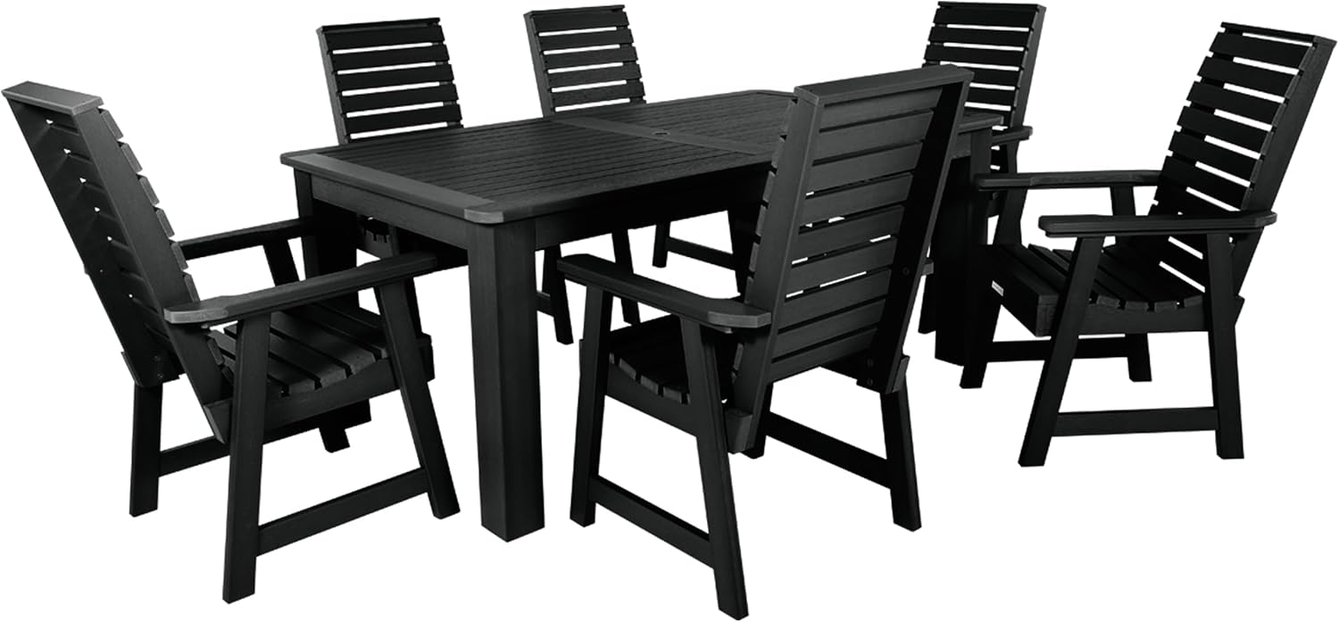 This Weatherly Dining Set features a 72-inch-long rectangular dining table with a 2-inch umbrella hole and 6 armchairs for a sleek seating and dining area. (Umbrella not included). Give your patio a modern centerpiece with our Weatherly outdoor dining set. Your friends and family will love eating in your outdoor space with this comfy and stylish backdrop. Made from durable and weatherproof materials, this outdoor dining set will last for years. This dining set is assembled with 304-grade stainless steel hardware and comes with the assurance of a manufacturer’s 12-year residential limited warranty. The chairs have been load-tested, per ASTM 1561-03 (2008) standard for outdoor plastic furniture and have a 400-pound weight capacity. Some assembly is required.