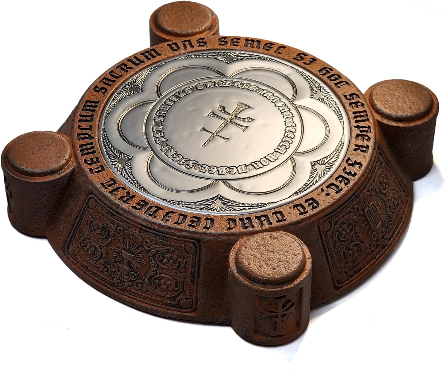 This listing is for one of our full size (1:1 scale) Holy Grail prop replica and one of our custom display bases for the Holy Grail. Our prop replica of the Holy Grail is cast in hard ceramic based resin, finished with a terra cotta base layer, gold foil application, and then painted with a multi-layer combination of colors for a true-to-life antique look and feel. The multi-layer paint job on the Holy Grail gives it depth that changes in appearance under various lighting conditions. This is a full size replica which matches the size of the prop used in the movie. Our display base was inspired by the appearance and colors of the Temple of the Sun featuring the Great Seal in the center. It is cast in hard resin, painted with a multi-layer combination of colors for a true-to-life antique look and feel, and the center disc is finished with a silver plating which was then antiqued. Since the great seal in the movie is not shown in great detail it is impossible to know what the words originally said. So, the engraving on our great seal was inspired by some related texts and reads "The Great Seal must never be crossed by the Holy Grail. If this should ever happen, then this temple would fall and the sacred vessel would be lost once more." The Holy Grail is about 6 inches (153mm) tall and about 4.5 inches (143mm) diameter. It weighs 15oz (400g). Note: technically you should not drink from this cup. In this day and age where everything is tested and regulated the authoritarian consensus is that the glue and the gold foil are not considered safe for food contact. FYI, the original cups were also made with gold foil and glue and Harrison Ford and Sean Connery both drank from the cup probably multiple times.