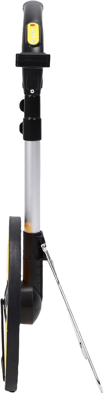 [High Accuracy Measurement] The digital measuring wheel offers exceptional accuracy with a tolerance of ±0.5% and a wide measuring range from 0.1m to 10000m or ft.Perfect for professionals who require reliable and accurate measurements for construction, landscaping and surveying projects. [Versatile & Reliable] Easily navigate tough environments such as grass, rocks and uneven terrain with this versatile measuring wheel. Its durable aluminum alloy and rubber construction ensures long-lasting performance in any conditions. [Sturdy and Stable] Equipped with a sturdy stand, this measuring wheel maintains a perfect balance on various terrains.The sturdy ground support ensures stability, allowing accurate measurements even on uneven surfaces such as grass, asphalt and rocky terrain. [Portable & Convenient] Featuring a three-section telescopic design with a single-key unlocking mechanism, this measuring wheel folds effortlessly for compact storage and easy transport.The included fabric carrying bag ensures protection and convenience on the go. [ERGONOMIC & COMFORTABLE] Designed with user comfort in mind, the digital measuring wheel features an ergonomic grip that reduces hand fatigue during extended use.Its lightweight yet durable construction makes it ideal for extended field work. Specifications: Item Type: Digital Measuring Wheel Material: Aluminum Alloy, ABS, Rubber Power supply: 2 AAA batteries, single capacity 300mAh (built-in) Maximum measurement range: 10000 meters or 9999.9 feet Accuracy: ±0.5% Wheel diameter: approx. 318 mm / 12.52 inches. Package List: 1 x Digital Measuring Wheel 1 x storage bag. 1 x measuring tape. Note: 1.If you measure a straight line, walk in line
