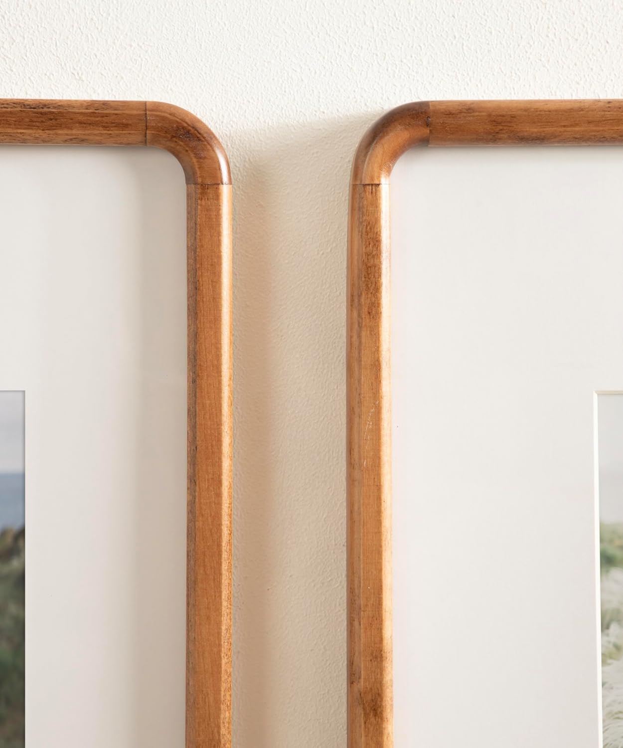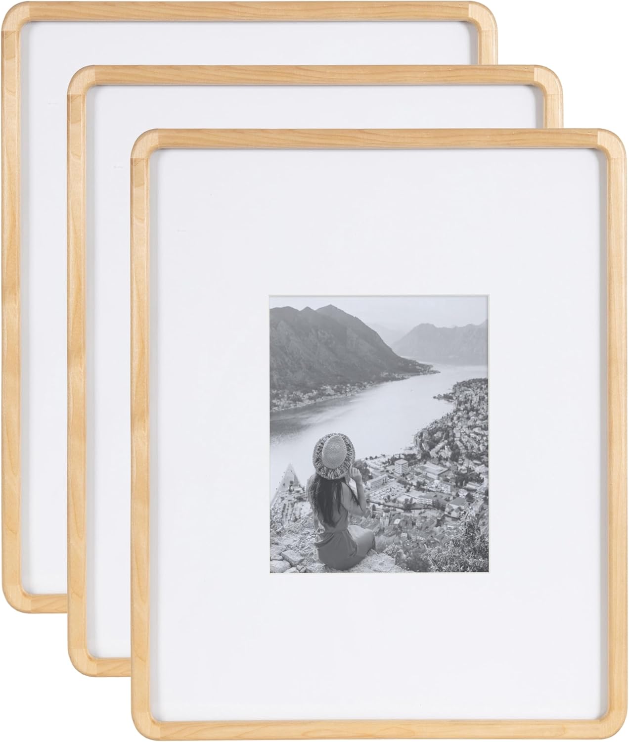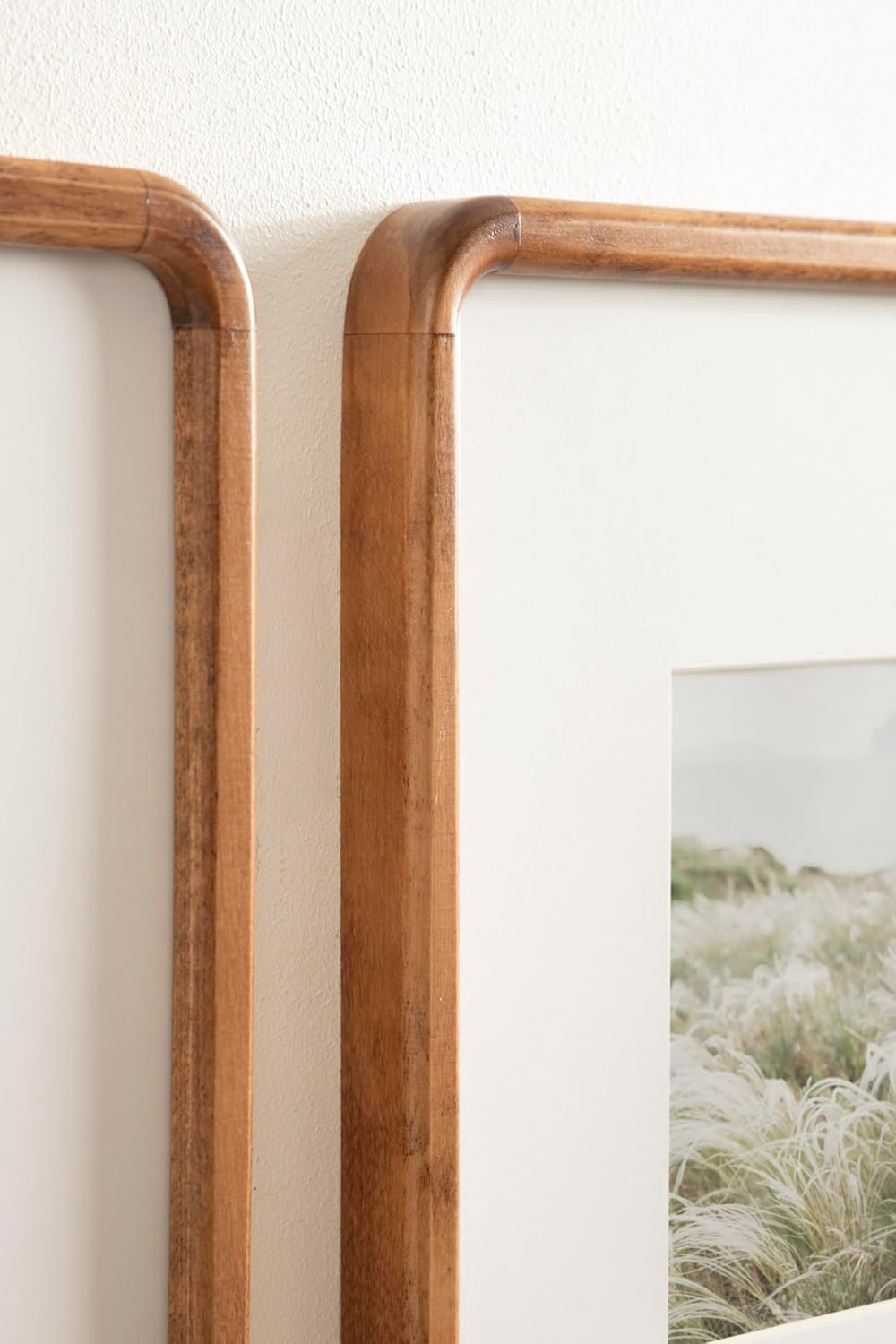 Display your family photographs where they can be a constant reminder of great memories with family and friends. Sharing those photos is a joy that brings both satisfaction and entertainment. This three-piece set fills your space with a refined look due to its mid-century walnut brown finish and radiused corners. Each solid wood wall frame includes an optional soft white beveled mat, protective glass, removable tab back, and metal hangers already attached for easy horizontal or vertical wall display. Each frame can hold an 8x10 photo when used with the included soft white mat or a 11x14 photo without the mat. The thick frame profile is 0.75 inches wide and 1 inch deep. The outer dimensions of each frame are 12 inches by 15 inches. Each frame's stunning design will highlight your art prints or treasured family photos beautifully. Combine with other frames or art pieces to create a beautiful and contemporary living room gallery wall. These versatile frames will effortlessly fit a variety of home decor styles without encroaching on the other decorative items throughout your home.