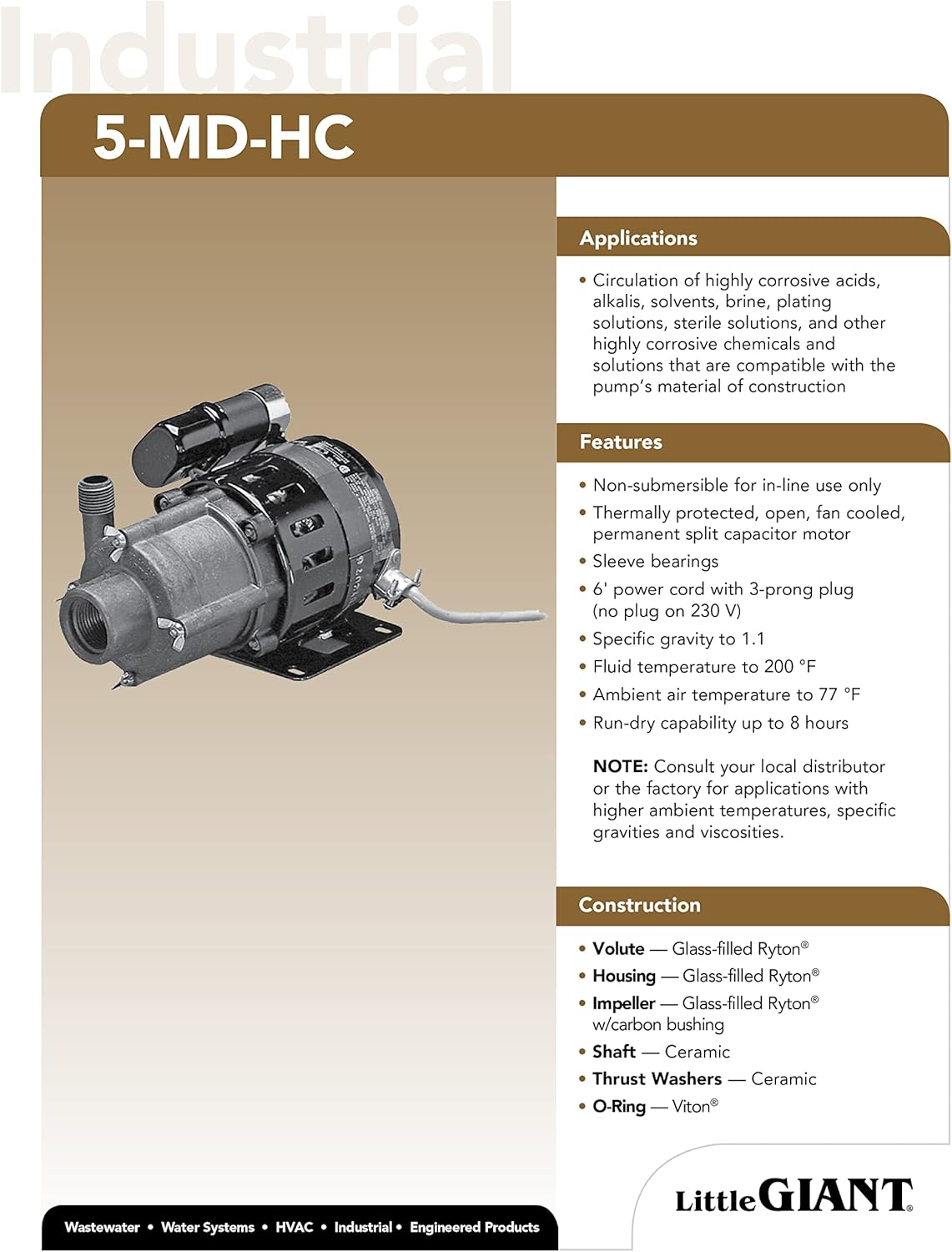 The Little Giant 115 Volt, 1/8 HP 5-MD-HC non-submersible magnetic drive pump is sued to circulate highly corrosive acids, alkalis, solvents, brine, plating solutions, sterile solutions, and other highly corrosive chemicals and solutions (1.1 specific gravity). Its volute, magnet housing and impeller are glass-filled polyphenylene sulfide for excellent chemical resistance. This pump utilizes pure carbon bushings to enable the pump to run dry for up to 8 hours at a time. This pump delivers up to 1050 GPH at 0-ft. lift and comes with a 6-ft. power cord with plug.