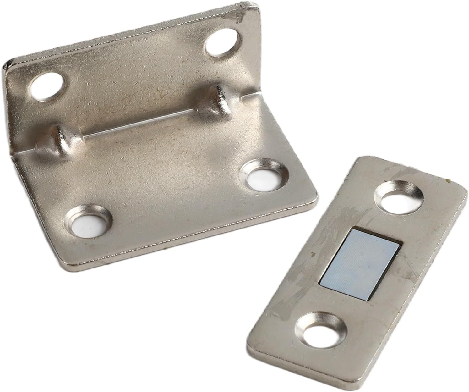 Features:* and*Made of material, and practical to use* Force: This door catch houses magnet to hold the constantly opening kitchen cabinet doors or drawers closed, suitable for using on the door which the latch or hinge is useless.*No Design: The L-shaped strike plate makes this for ultra thin drawer catch keep the door closed tightly with no .*Easy to Install: Equipped with , you don't need to use screws when installing, just tear off the and it on the position to be installed, also provide screws for your installation.*Applications: Strong enough to keep cabinet door, drawer, lid, sliding wardrobe door or duette blinds closed, perfect for locker doors in a caravan.*Durability: These flat magnets for cabinets are made of cold rolled steel, against cracking, more and long lasting.Specification:Material: cold rolled steelColor: black, silverType: 4 pairsSize(approx): 16*41*2.5mm/0.63*1.61*0.1inch(width*length*thickness), 16*41*25*1.5mm/0.63*1.61*0.98*0.06inch(width*length*height*thickness)Package Contents:4 pairs * cabinet catch4 pairs * adhesives16 pcs * screwsNote:1. The real color of the item may be slightly different from the pictures shown on website caused by many factors such as brightness of yourand light brightness.2. Please allow slight manual measurement deviation for the data.