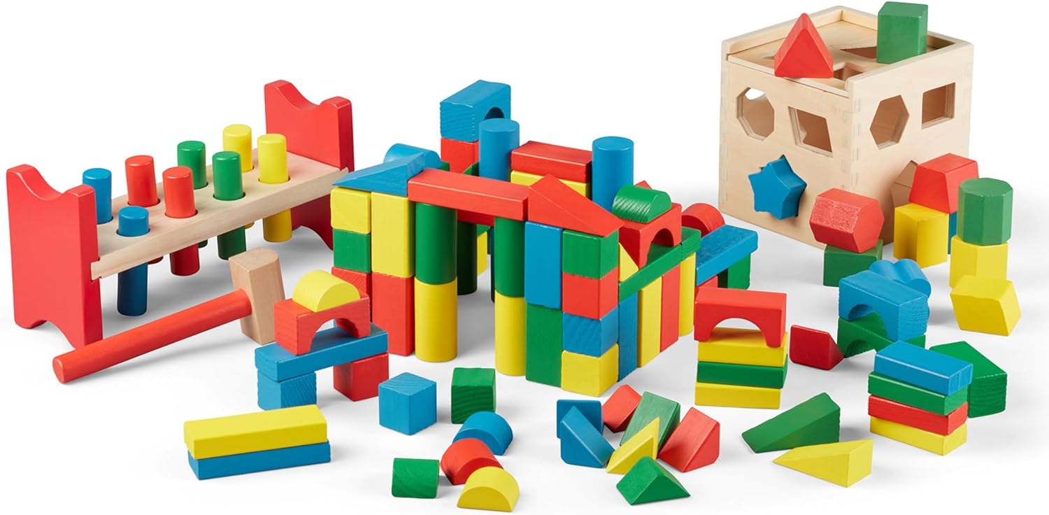 Exercise fingers and brains with these beautifully crafted, made to last classic wooden toys designed to entertain and engage! The Melissa & Doug Stack, Sort & Pound Wooden Toy Collection includes three childhood favorites: 100 brightly colored building blocks, a 14-piece shape sorting cube, and a 10-piece pounding bench with mallet. Kids two and older will delight in stacking, building, sorting, and hammering, while gaining invaluable practice with fine motor skills and dexterity, color and shape recognition, and pre-math skills.