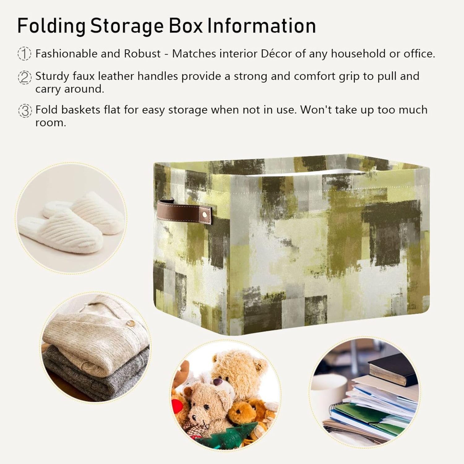 Transform your space with these Abstract Art Yellowish Green Multi-Purpose Organization Bins for Closet Shelves! Designed to provide efficient organization, these large rectangular storage boxes are perfect for a variety of settings including your home, nursery, baby room, kids' room, kitchen, closet, office, garage, dorm, and laundry area. Whether you're tidying up clothes, toys, books, or pets supplies, these bins are the ultimate solution for keeping everything in its place.Crafted from high-quality canvas with a waterproof fabric inner lining. The stable metal frame provides sturdy support, while the heavy duty handles make it easy to transport items from one room to another. Each bin features a charming decorative pattern that adds a touch of style to your organization efforts.With a collapsible design, these storage baskets can be easily stored away when not in use, making them a practical choice for any environment. Ideal as a storage basket, picnic basket, gifts basket, or even a laundry basket, their multiple uses offer endless possibilities.Easy-Clean Canvas Baskets, only needs wipe cleaning, ensuring your bins remain fresh and ready for action. Elevate your organizing game today with Decorative Canvas Bins—the perfect blend of functionality and flair for every corner of your life!
