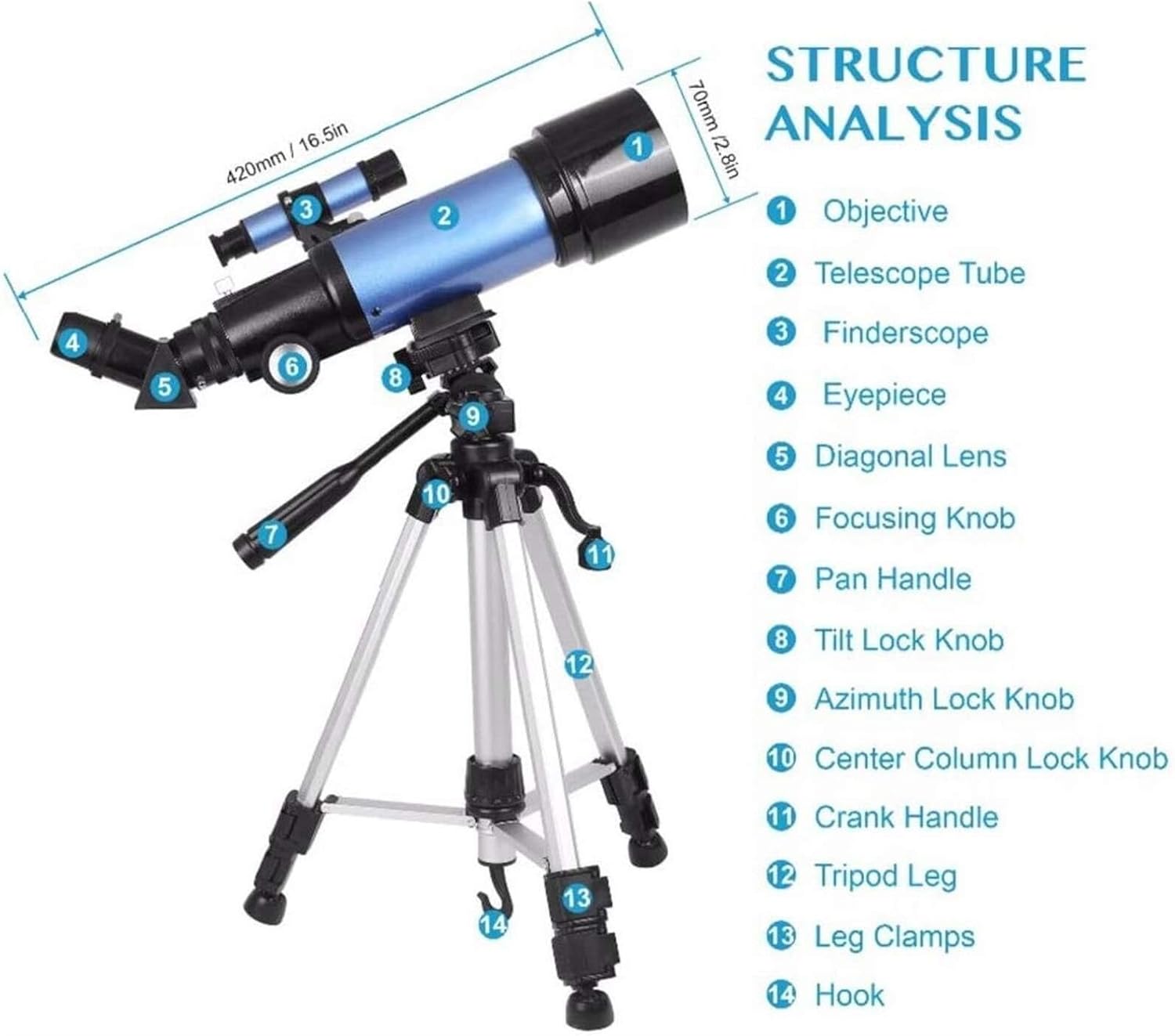 Embark on a cosmic adventure with the Portable 70mm Aperture 400mm Astronomical Refractor Telescope, an ideal entry-level telescope for kids and beginner astronomers. Whether you're observing the moon, planets, or wildlife during the day, this telescope provides a versatile, powerful solution for both daytime and nighttime observation. With 20X-200X magnification, you can enjoy breathtaking views and detailed images of celestial bodies from the comfort of your home or on outdoor adventures.This refracting telescope features a 70mm aperture and fully-coated optical glass, allowing more light to pass through for brighter, clearer views. It's designed with easy-to-use controls, making it perfect for young astronomers who are just starting to explore the wonders of the night sky.The smartphone adapter allows for simple astrophotography, so you can capture stunning images of stars, planets, and more. Plus, the compact carry bag makes it easy to take the telescope on your travels. Whether for birdwatching, scenic views, or stargazing, this telescope is a great tool for anyone looking to explore the universe.With quick assembly and no extra tools required, this telescope is perfect for both children and adults, offering a hands-on way to enjoy the fascinating world of astronomy. It's the perfect gift for encouraging kids to explore science, nature, and the unknown.