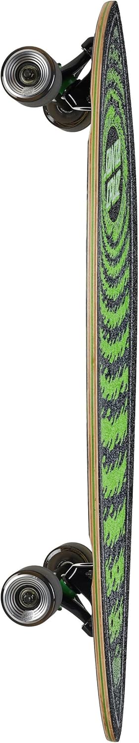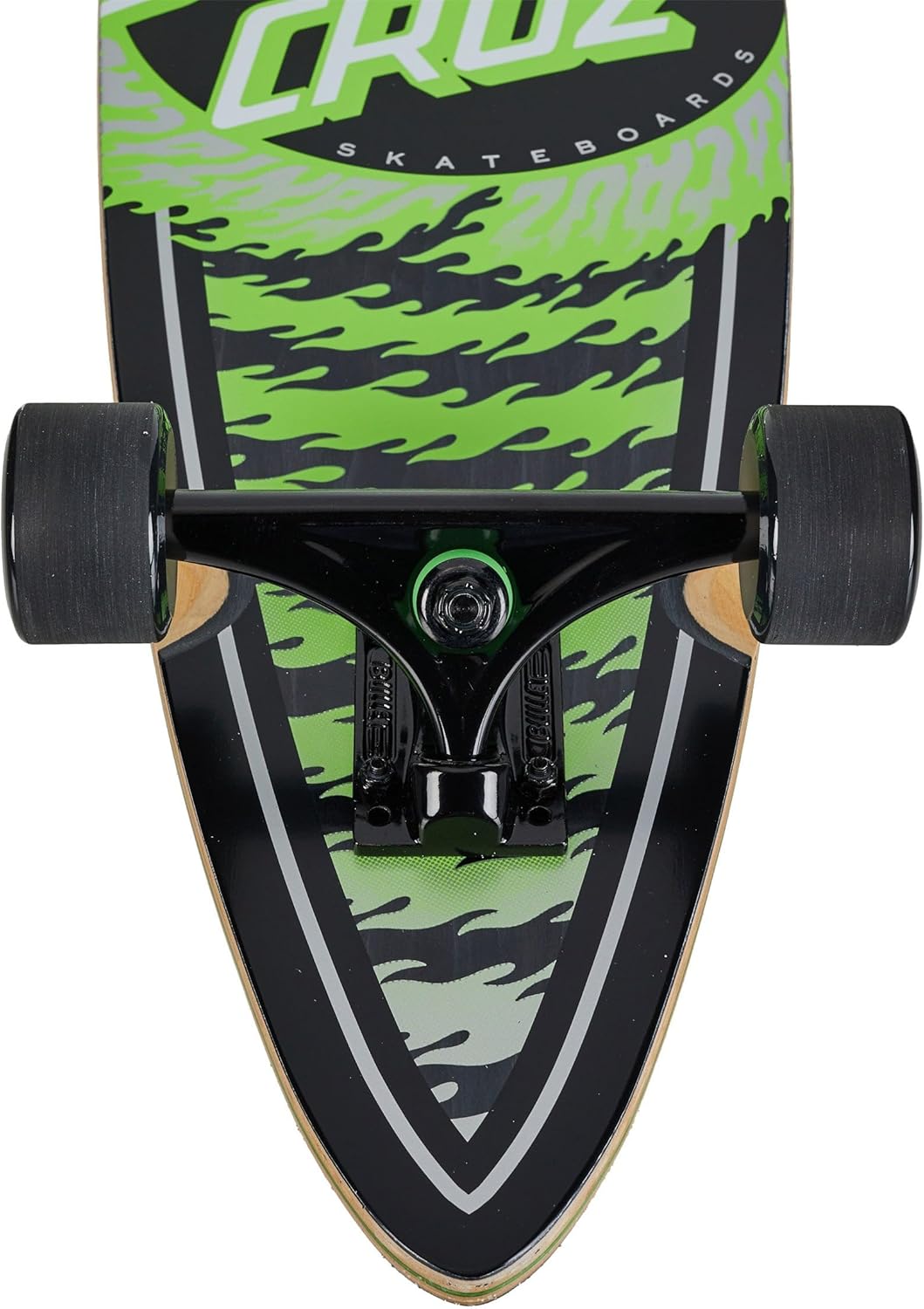 The Santa Cruz Skateboards Flame Ringed Dot Pintail Longboard Cruiser is ready to rip and features spot gloss graphics on small 9 ply pintail shaped deck with wheel wells, Bullet 160mm reverse kingpin trucks and transparent black Santa Cruz branded 60mm 78a Slime Balls wheels with metallic silver graphics.