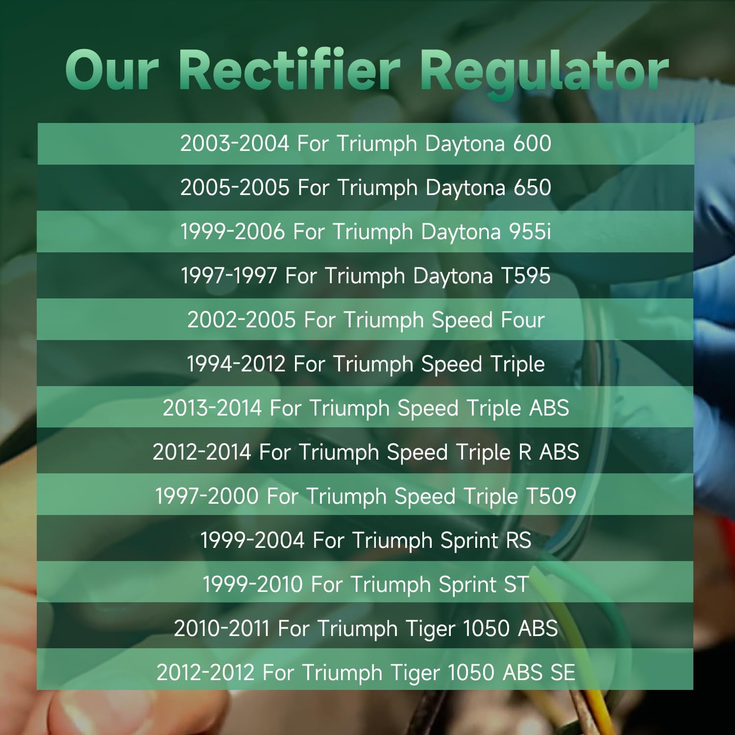 | Special Features | 12V, 1997-1998 for Triumph Daytona 2003-2004 for Triumph Daytona 600 2005 for Triumph Daytona 650 1999-2006 for Triumph Daytona 955i 2002-2005 for Triumph Speed Four 1994-2014 for Triumph Speed Triple 2009-2014 for Triumph Speed Triple R 1999-2010 for Triumph Sprint 2007-2012 for Triumph Tiger 1050 2011-2013 for Triumph Tiger 800 1996-1996 for Triumph Trophy 3 900 1995 1997-2002 for Triumph Trophy 900 |