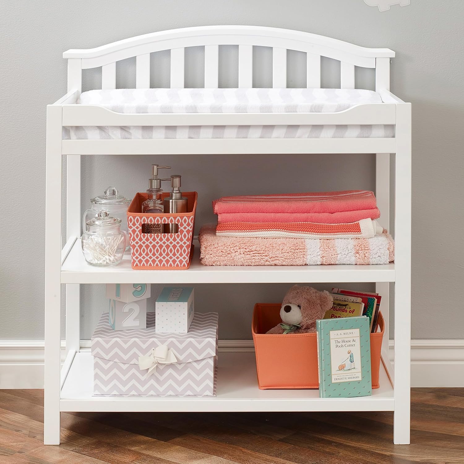 | Additional product features | 2 spacious shelves for storage, A comfortable changing surface for your baby and storage for diapering essentials, Finish: White |