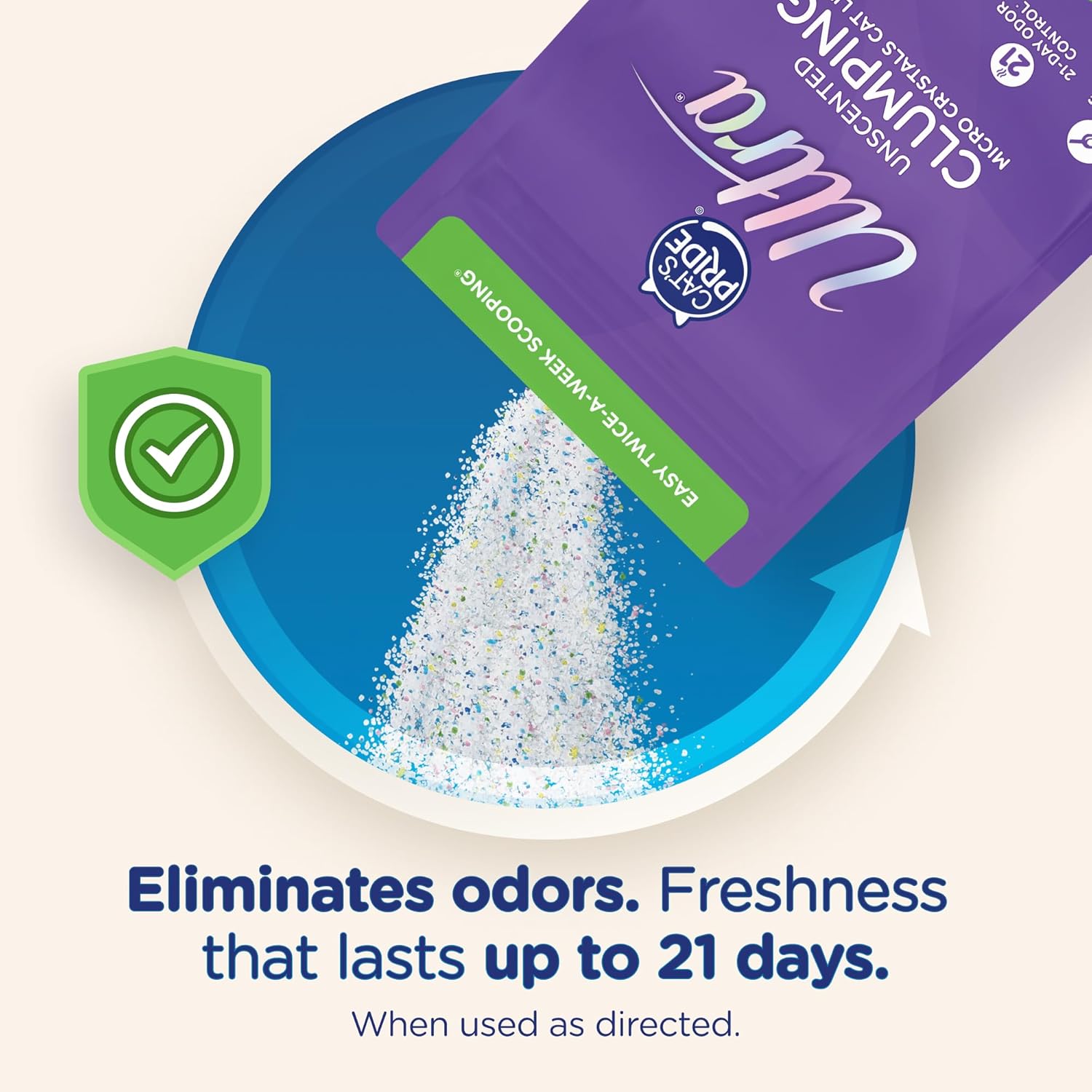 Ultra Clumping Crystals cat litter with are the ultimate clumping litter for odor control. Ultra Clumping Crystals Litter uses the highest quality Silica Gel crystals available plus a natural clumping agent. Silica Gel is safe, non-toxic and allergen-free. Not only are Ultra Clumping Crystals Litter is safe for cats and people, they are also lightweight with high absorbency properties, requiring less litter than clay and other types of litters. This means, using Ultra Clumping Crystals Litter, less litter per cat ends up in the landfill. Ultra Clumping Crystals Litter traps odors on contact. When used as directed with every other day scooping for one cat Ultra Clumping Crystals Litter will keep the litter box fresher, longer. Ultra Clumping Crystals Litter is super soft on paws and have bright colors for a more pleasant litter experience.
