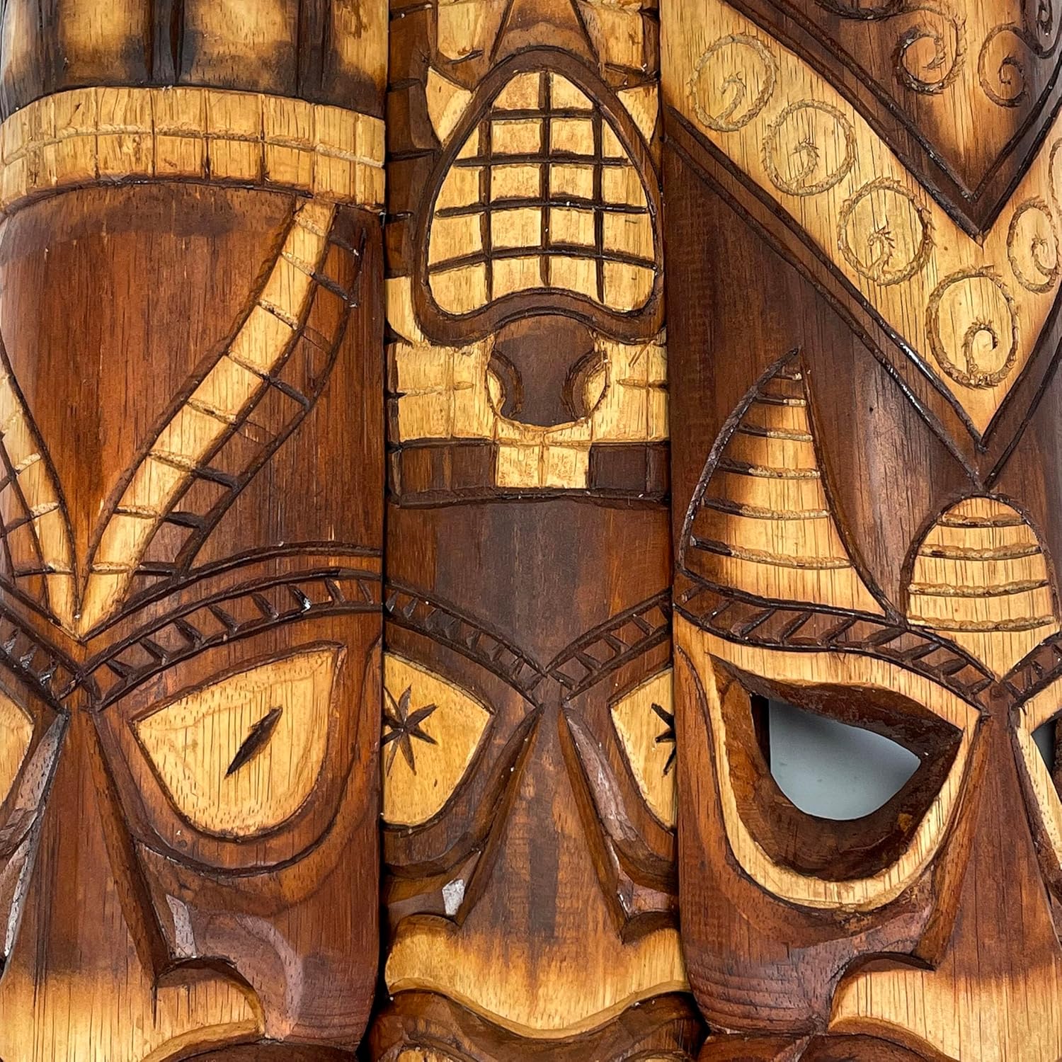 Elevate your home's ambiance with this enchanting Set of 3 Polynesian-Style Wooden Wall Masks. Hand-carved with intricate details from Indonesian Albesia wood, these masks are infused with an island-inspired charm. Each mask, measuring approximately 23.75 inches in height, 5.75 inches in width, and 3.5 inches in depth, showcases the artisan's skill in crafting these unique pieces. Adorn your walls in various spaces such as patios, living rooms, offices, bedrooms, and kitchens, infusing a touch of Hawaiian and tropical allure into your decor. The dark natural finish adds depth, creating a captivating atmosphere reminiscent of a beachside retreat. These masks, with their distinct Polynesian design, are more than decorative accents; they are a statement of artistry and cultural appreciation. Their versatile nature allows them to grace both indoor and outdoor settings, transforming any space into a serene tropical haven. Whether hung individually or as a set, these masks become focal points, inspiring conversations and admiration. Ideal for gifting, these handcrafted masks convey the warmth and uniqueness of your gesture. Please note that due to their handmade nature, each mask possesses subtle differences, ensuring you own a truly one-of-a-kind piece that embodies the essence of Polynesian craftsmanship. Embrace the spirit of the islands and let these masks bring an island-inspired touch to your living spaces.